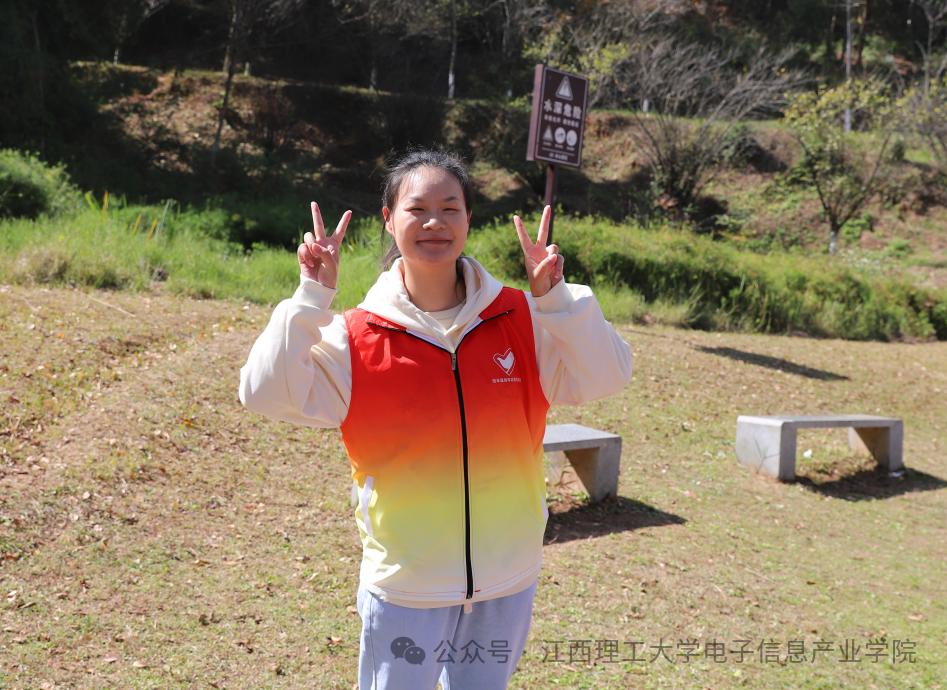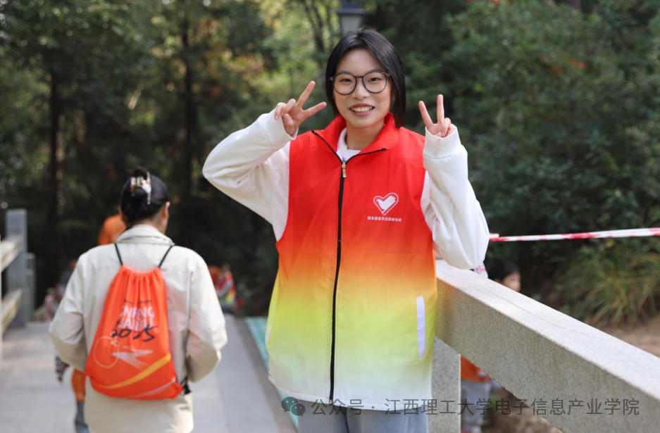 23级电科2班杨璐说:“秋天带来丰收,活力在谷山绽放。我作为信丰阁东楼梯的小道上的志愿者,楼梯较多,安全防范必不可少。我的每一句细心叮嘱都有回应,会换来参赛者的微笑及一句“辛苦了”。每当这时,我心里总会升起一种的感动。这让我懂得我的工作是有意义的,更是有温度的,这次经历让我懂得,它不仅是付出,更是收获。”